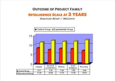 After 36 months, the children in the experimental group were far better developed that children from the control group – as shown on this graph. Domains of development that were assessed include “language, eye-hand coordination, memory, social intelligence and reasoning ability” as indicated on the graph on the slide.