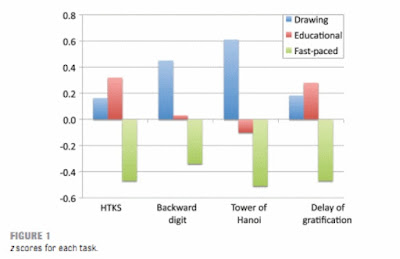 When the 3 groups of children were challenged directly afterwards to repeat a series of 3 numbers backwards, solve a problem and exert self-control, the group that watched the high-paced were so over-stimulated by the overbearing sights and sounds that they basically shut down. Most of them failed all the challenges as shown below.