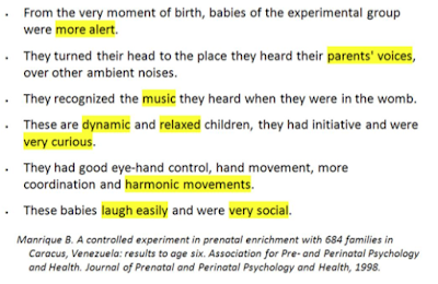 The most comprehensive and influential study that has ever been conducted in this field involved 684 low income families, who lived in Caracas, which is the capital of Venezuela. It was called “Project Family”. Dr Beatriz Manrique, who directed the research, was awarded the Thomas R. Verne Award for Outstanding Contributions to Pre- and Perinatal Psychology in 1995. She and her colleagues analyzed the impact of early stimulation techniques that were implemented from 20 weeks pregnancy and throughout the formative years, on the development of children. Interestingly, they recorded noticeable differences between the functioning of babies who were stimulated before birth (the experimental group) and other babies (the control group) when the babies were only 25 days old.
