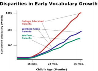 According to their findings, professional adults speak to their babies and toddlers more frequently and they are more encouraging when they speak. They use more descriptive language and a wider variety of different words (a richer vocabulary). By the time their children celebrate their 3rd birthdays, these privileged children have been exposed to roughly 30 million more words compared to children who were born into families at the other end of the social spectrum (families on welfare). Consequently, the children of professionals typically interact with their environment more confidently and intelligently from an early age. They generally use and understand more than twice as many words at the age of 3, compared to their less fortunate peers. (An average vocabulary of 1116 words compared to an average vocabulary of 525 words.)